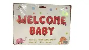 Pack Includes: Foil balloons spelling “WELCOME BABY”